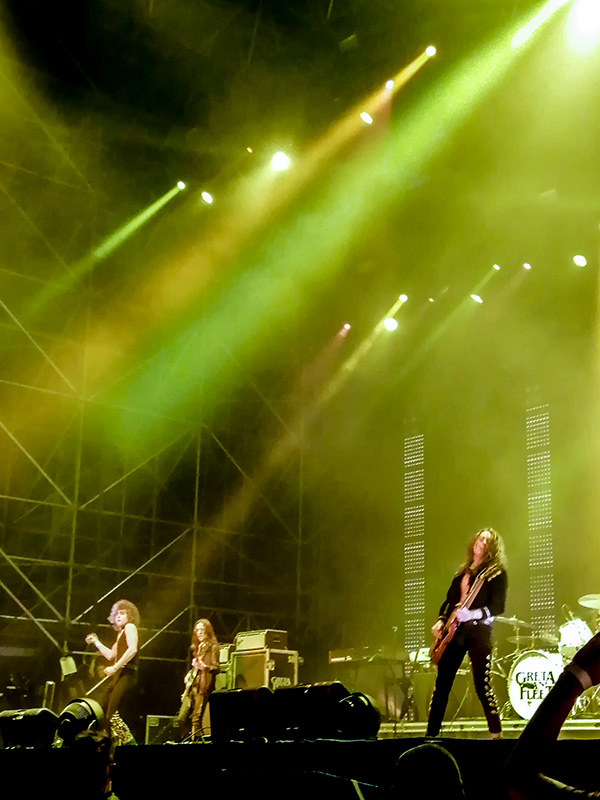 Con fatica ci riesco, la transenna, lato destro, è mia. Attesa lunga, tre ore infinite, ma tutto a un tratto arrivano le 8, siamo già distrutte, il dolore ai piedi si fa sentire e si sa la lotta per la transenna non è che il principio, il vero e arduo compito è mantenerla. Alle 8 però salgono sul palco i The Hunna, non so molto di loro, ma fanno un punk rock con una metrica e testi quasi più pop. Lì per lì nulla di che, ma dopo poco mi rendo conto di quanto groove e punk ci sia in quelle canzoni e vi dirò sono rimasta sorpresa, perché sono riusciti a scaldare il pubblico molto bene, e Bologna non si è fatta attendere nella risposta tanto che io stessa mi sono sorpresa nel sentire dei veri e propri boati, da un Parco Nord gremito, si parla di record del Sonic Park, 20000 persone e oltre. D’altronde non mi ero resa conto di quanta affluenza ci fosse, una quantità di persone enorme, l’arena Joe Strummer è piena e pronta per i Greta van Fleet. E loro sono lì pronti. Salgono sul palco alle 9.20, con la solita corsetti a di Josh intento nel lancio delle rose, un simbolo, un omaggio un modo per essere vicino e unito al suo pubblico.