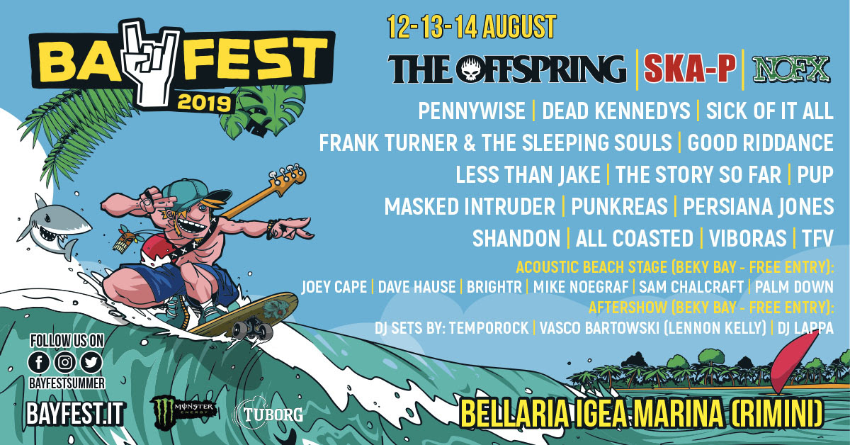 Anche quest’anno il Bay Fest regalerà grandissime emozioni con la qualità straordinaria della propria offerta musicale, ma il grande punk rock non sarà l’unica attrazione della tre giorni sulla riviera romagnola. Dal 12 al 14 agosto al Parco Pavese e al Beky Bay di Bellaria Igea Marina (Rimini) ci saranno infatti intense performance sul palco acustico, scatenati aftershow, il campeggio già sold out e un’ampia offerta di cibo all’interno del festival.