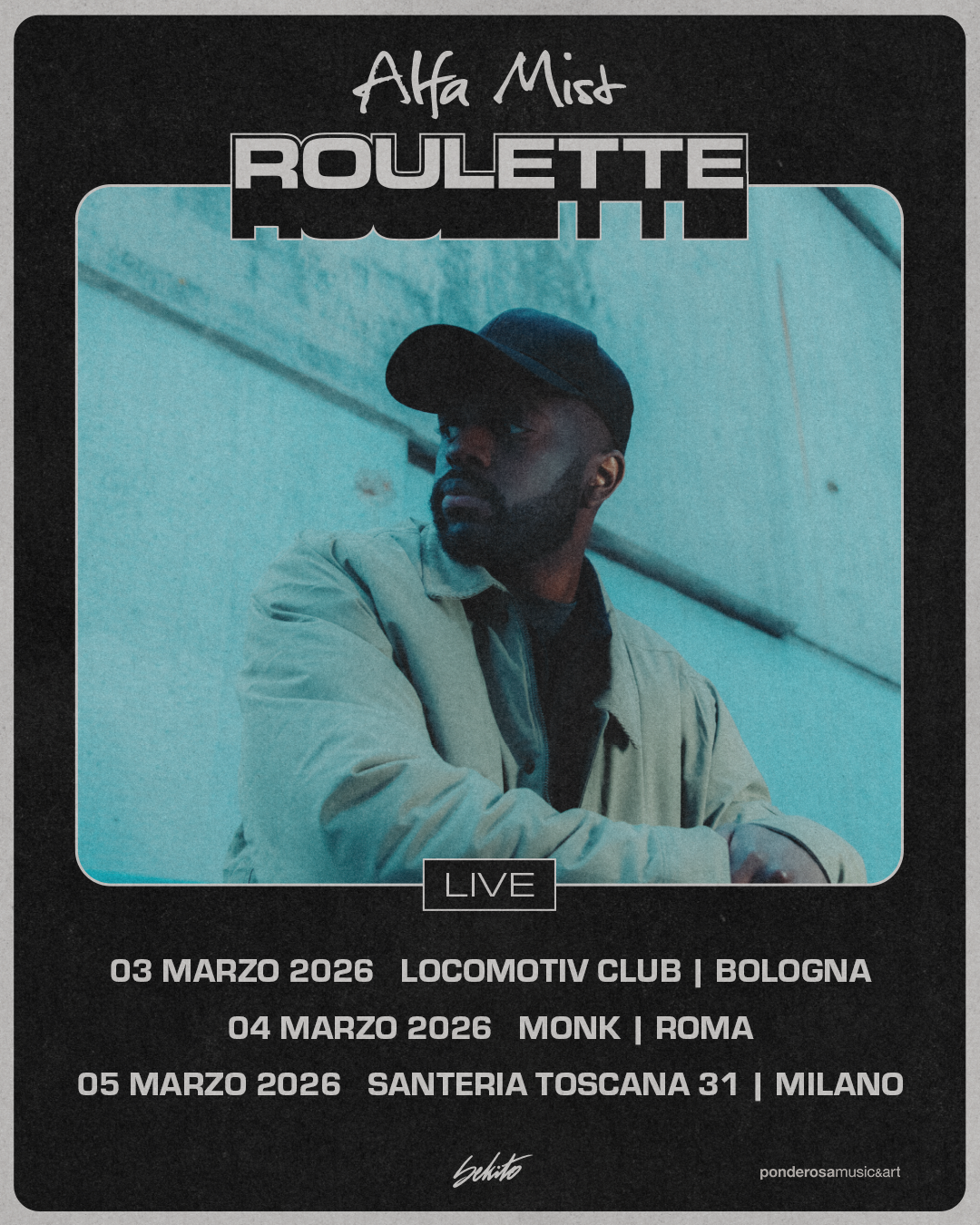 Il produttore, rapper e pianista Alfa Mist torna in Italia per tre appuntamenti imperdibili: il 3 marzo al Locomotiv Club di Bologna, il 4 marzo al Monk di Roma e il 5 marzo a Milano, sul palco della Santeria Toscana 31. Tre date che offriranno al pubblico italiano la possibilità di ascoltare dal vivo Roulette, il nuovo album in uscita il 3 ottobre per Sekito Records.