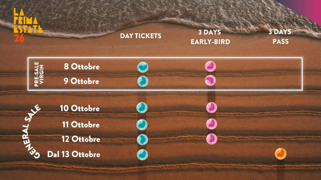 General Sale biglietti day tickets + abbonamenti Early Bird a prezzo scontato (disponibilità limitata) da venerdì 10 ottobre: TicketOne e Laprimaestate.it/tickets