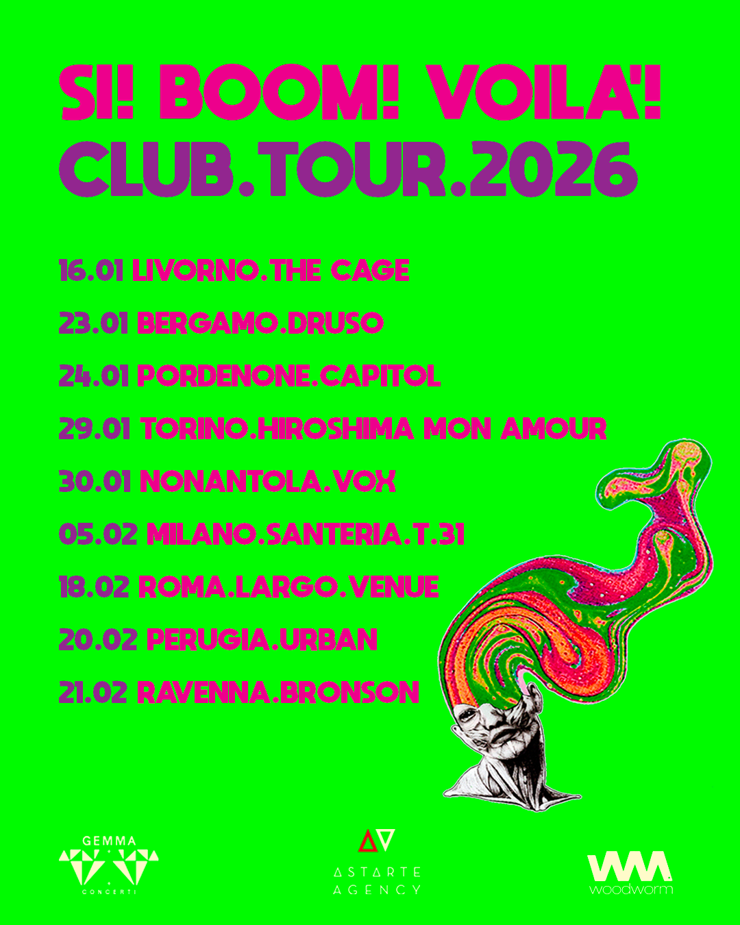 Dopo aver annunciato il singolo d’esordio PINOCCHIO, disponibile dal 14 novembre per Woodworm, i SI! BOOM! VOILÀ! presentano il CLUB.TOUR.2026, un viaggio nei club delle principali città italiane prodotto da Gemma Concerti.